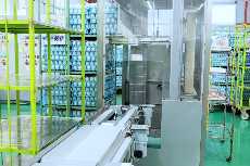 集卵された卵は、チェーンコンベアで運ばれ、自動で専用ラックに積み込まれ、一時的に保管されます。