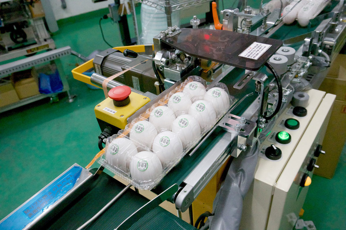 鶏舎からベルトコンベアで運ばれた卵は、ファームパッカーにて専用のケースに収納されます。