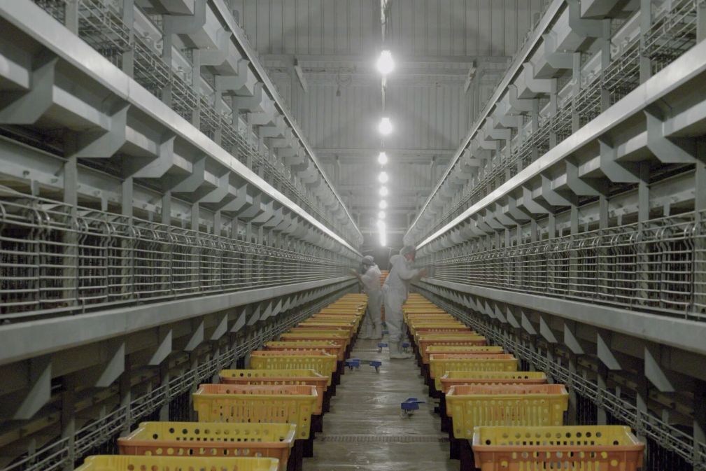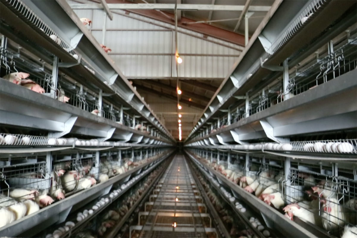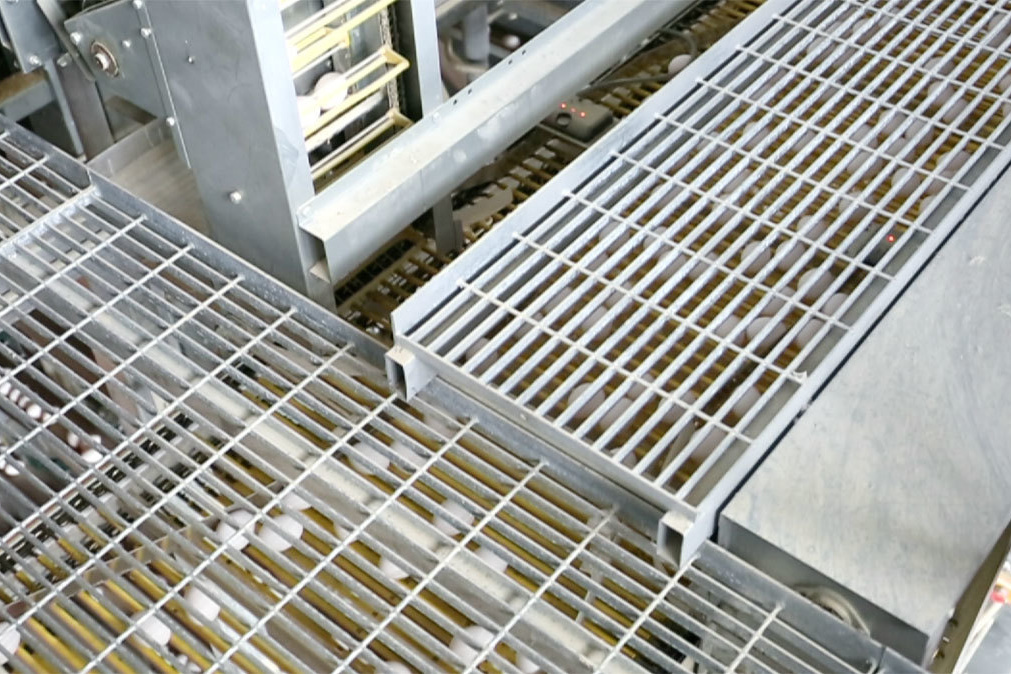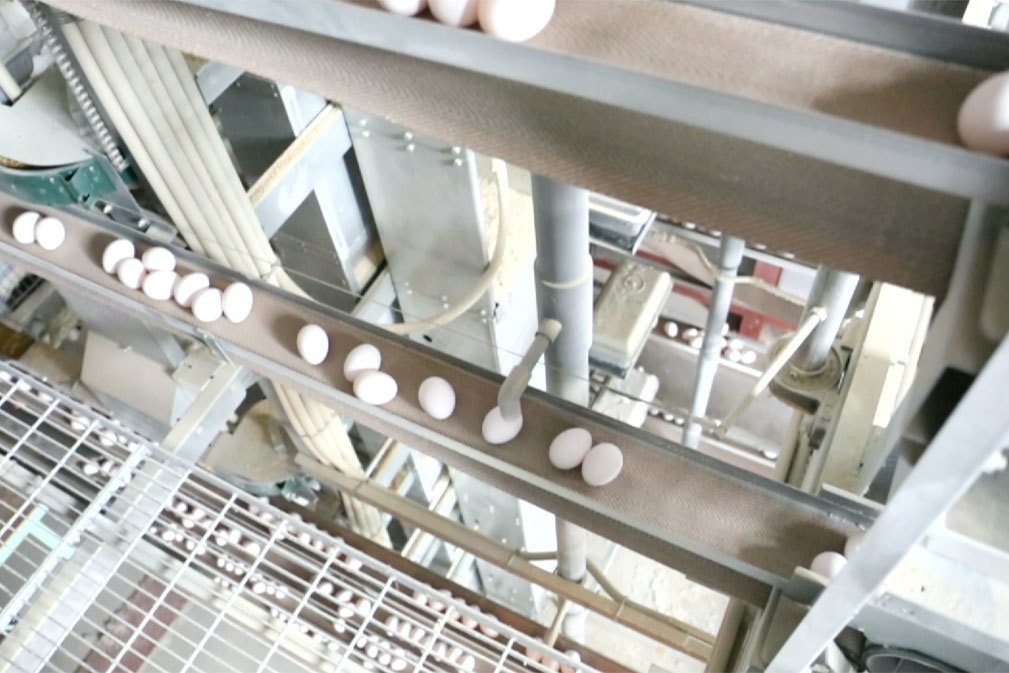 鶏舎内で集められた卵は、ベルトコンベアにて集卵センターに運ばれます。