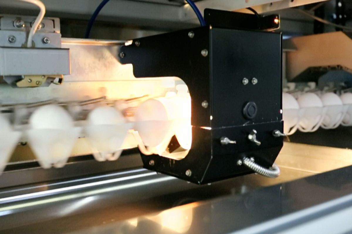集卵された卵は、チェーンコンベアで運ばれ、自動で専用ラックに積み込まれ、一時的に保管されます。